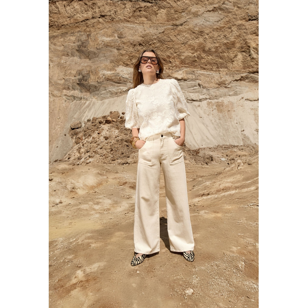 Deze crèmekleurige blouse straalt zachtheid en elegantie uit. De subtiele bloemenstructuur in de stof geeft de blouse een verfijnde en luxe uitstraling. Het model heeft korte mouwen met een lichte pof, een ronde hals en een knoopsluiting aan de achterkant van de hals voor een mooi detail.