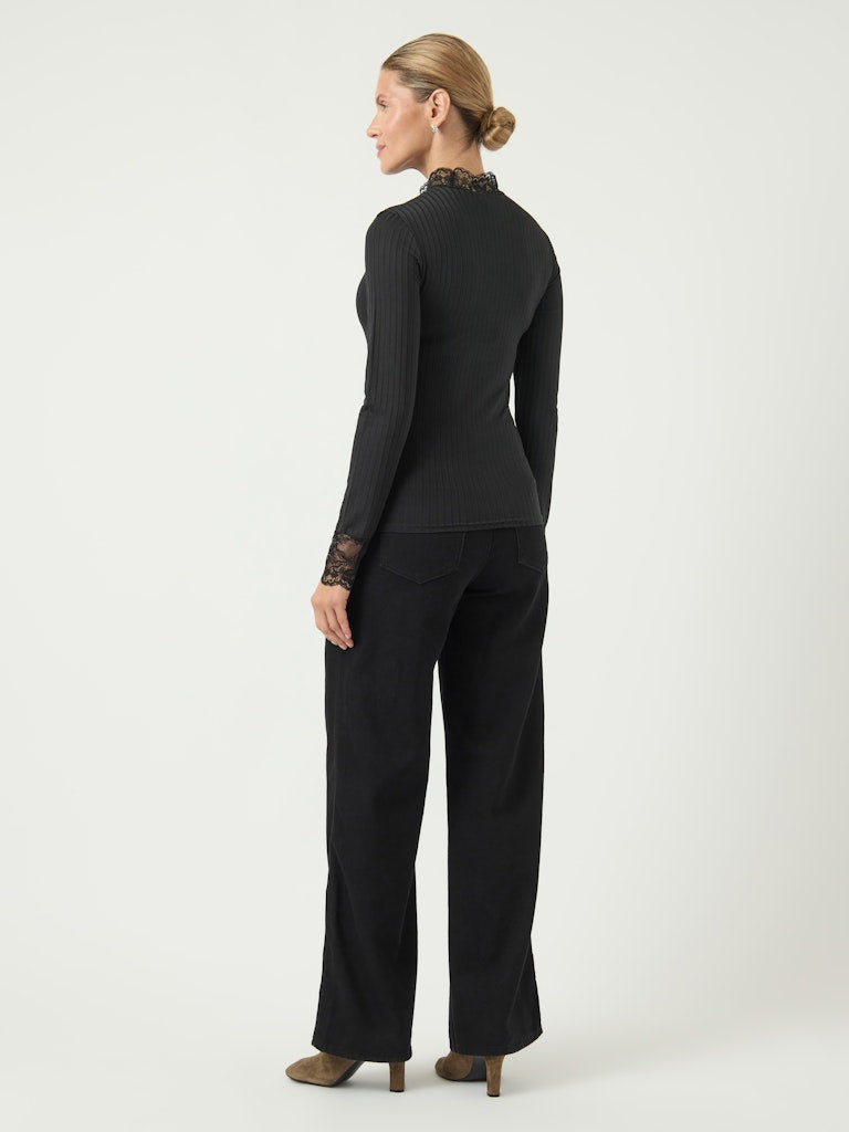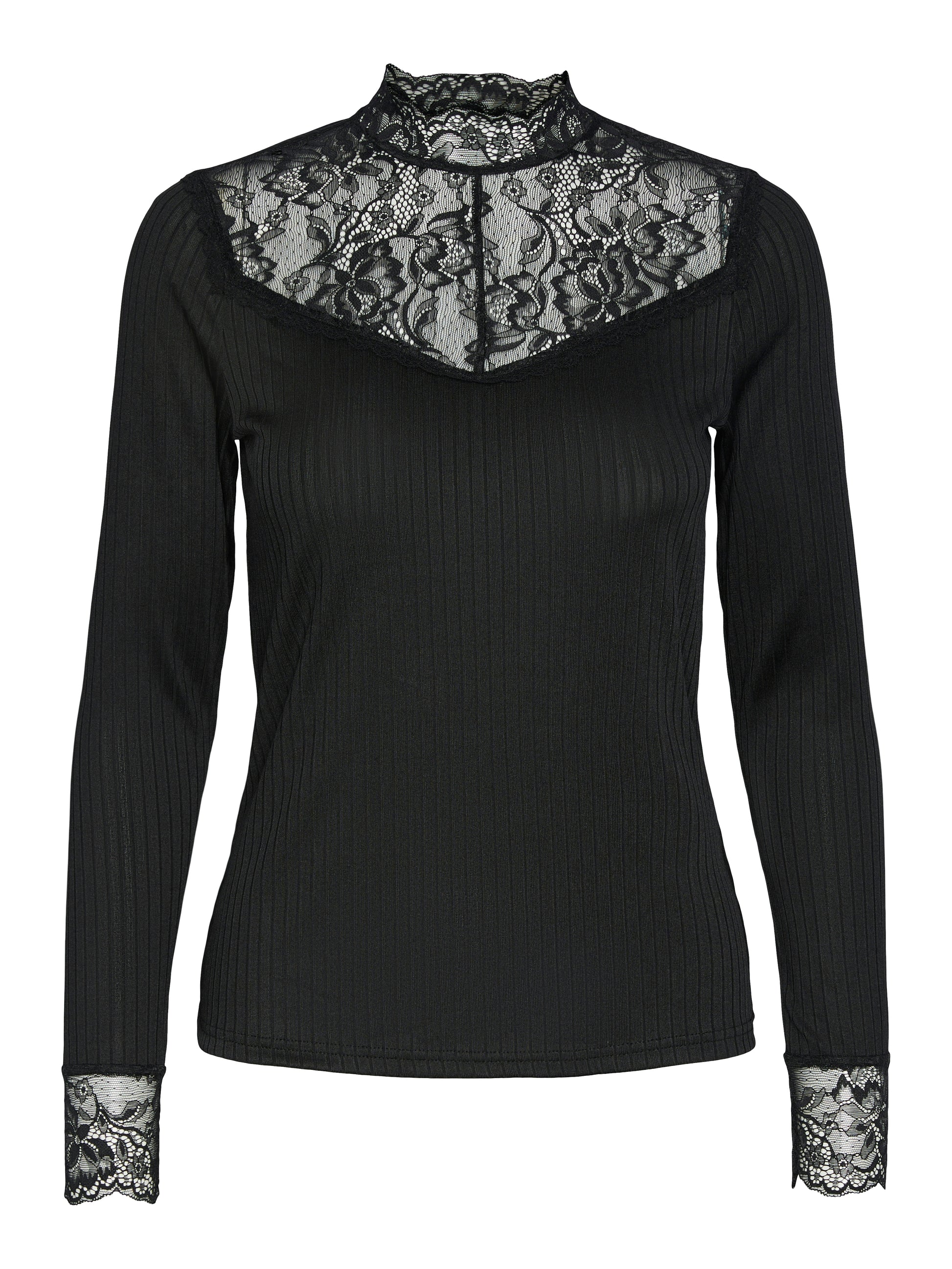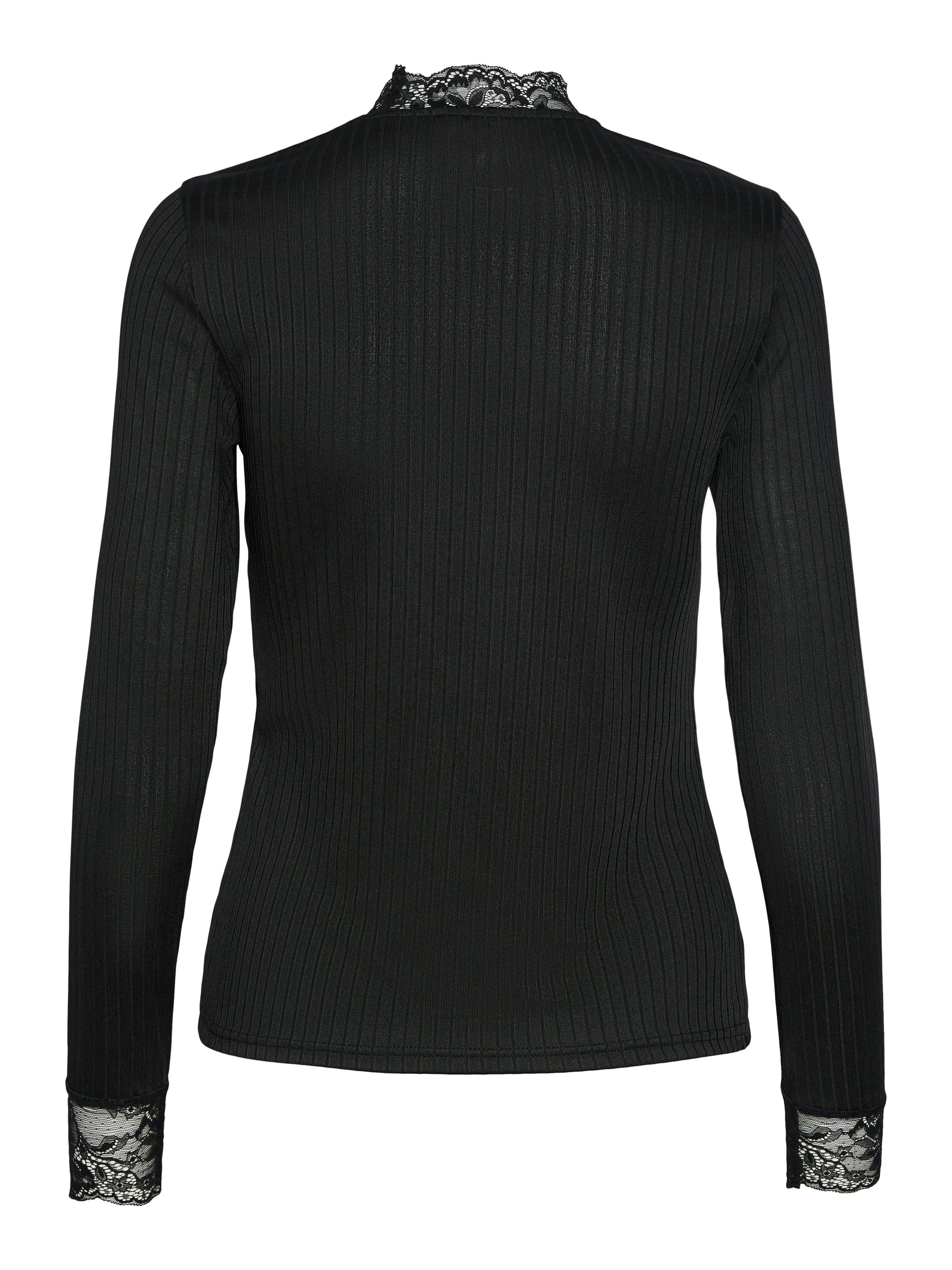 Deze elegante ribgebreide top is een perfecte mix van vrouwelijk en chic. De top is gemaakt van een comfortabele, zachte stof met 95% gerecycled polyester en 5% elastane, waardoor hij mooi aansluit en prettig meerekt. De verfijnde kantdetails bij de hals en manchetten geven de top een romantische en luxe uitstraling. De hoge hals zorgt voor een elegante look, terwijl de subtiele transparantie van het kant net dat beetje extra toevoegt.