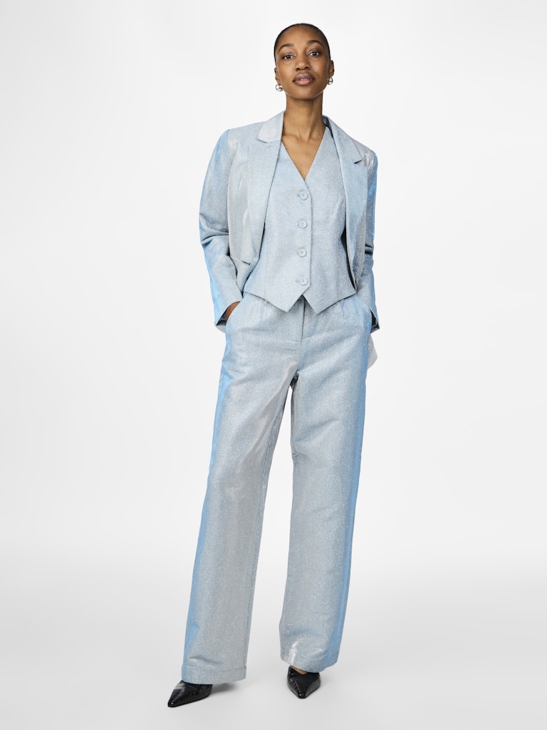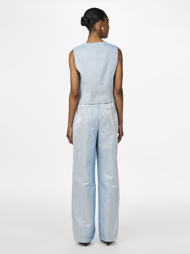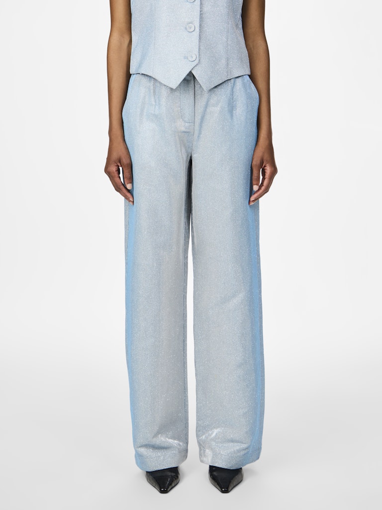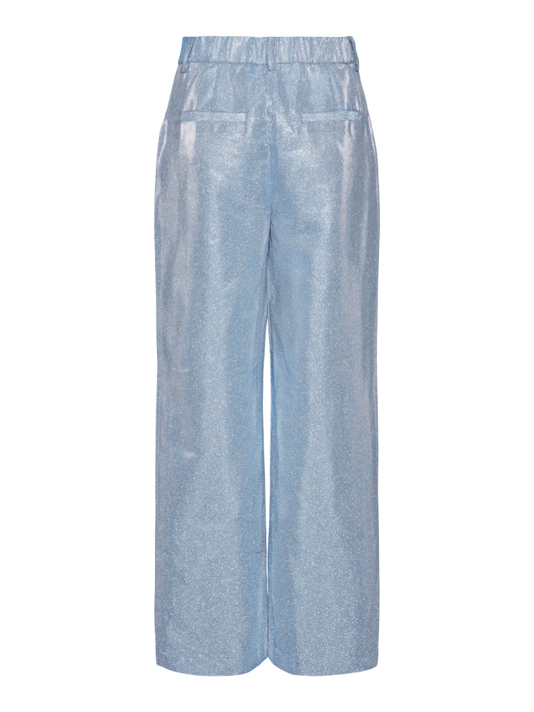 Maak je glamlook compleet met deze lichtblauwe glitterpantalon met ribstructuur.