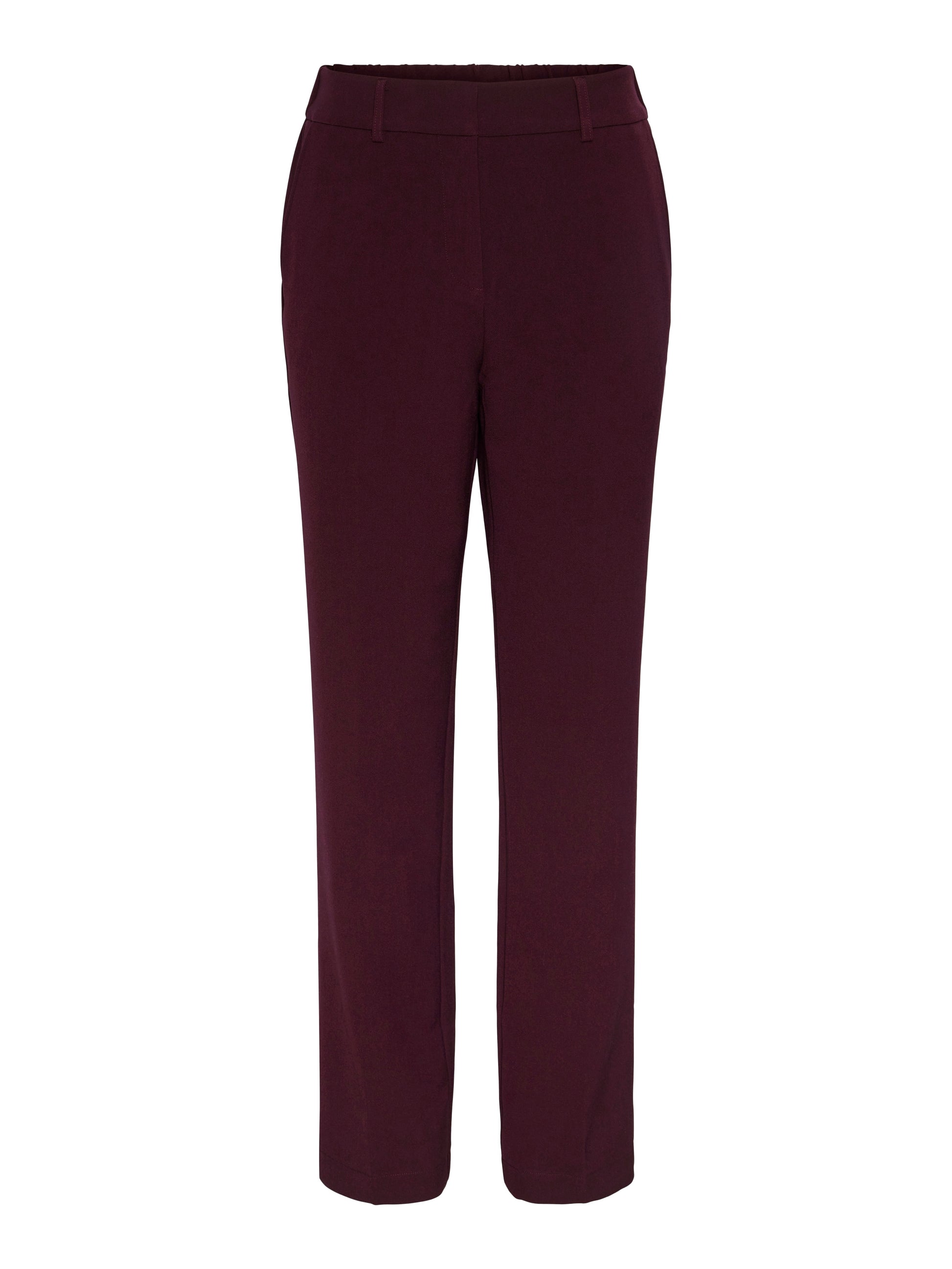 De pantalon valt hoog in de taille, heeft riemlussen, een knoop- en ritssluiting en tevens een elastische tailleband aan de achterzijde.
