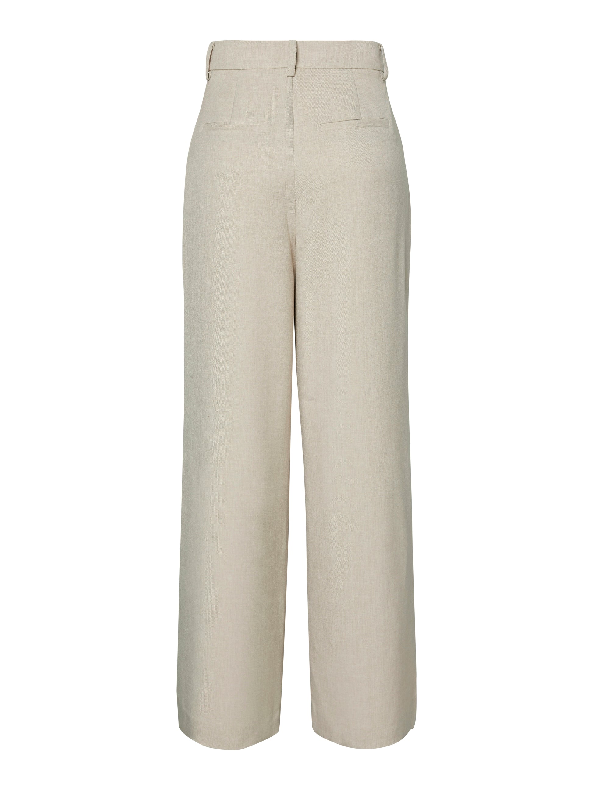 Deze wijdvallende pantalon in een zachte zandkleur is een must voor je garderobe. Het gemêleerde materiaal geeft een luxe uitstraling, terwijl de hoge taille, bandplooien en riemlussen zorgen voor een elegante pasvorm met een moderne knipoog. De dichtgestikte achterzakken maken de look clean en verfijnd.